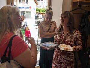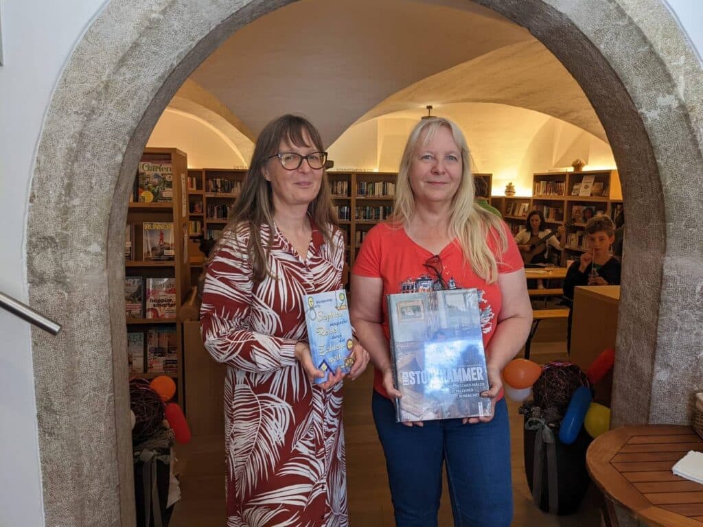 Seit 10 Jahren hat die Bücherei Jenbach ihren Standort in der Achenseestraße unter den historischen Gewölben im Keilerhaus. Am 21. Mai feierte die Bücherei bei einem bunten Fest für Kinder und alle Interessierten – wir schauten auch vorbei. Silvia Hunschofsky, die auch als Autorin aktiv ist, überreichte Büchereileiterin Michaela Noll zum Jubiläum zwei eigene Bücher – das einzigartige Nachschlagwerk zu den Stockhammer-Fresken in Jenbach und das Kinderbuch “Sophies magische Reise durch die Zahlenwelt”. Beide gab es schon vorher in der Bibliothek, aber nun muss niemand mehr darauf warten, wenn es schon ausgeliehen ist.