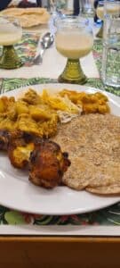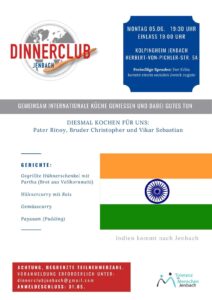 Die talentierten Köche des Abends waren niemand Geringeres als Pater Rinoy, Bruder Christopher und Vikar Sebastian mit ihrem Team. Gemeinsam hatten sie ein beeindruckendes Menü zusammengestellt, das die Gäste mit authentischen indischen Gerichten verwöhnte. Vom würzigen Kichererbsen Curry bis hin zu Hähnchenschenkel mit Partha Brot, sowie einer indischen Pudding Nachspeise mit Bananenchips, gab es für jeden Gaumen etwas zu entdecken.