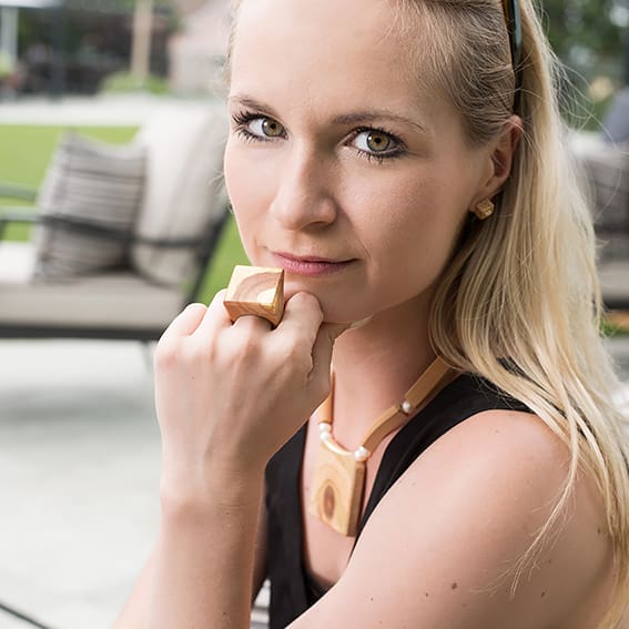 Auf dem Bild trägt unsere Kundin ein exklusives Set aus Ring, Kette und Ohrsteckern – aus edlem Zirbenholz gefertigt und mit viel Liebe zum Detail veredelt. Die natürliche Maserung macht jedes Stück zu einem Unikat.