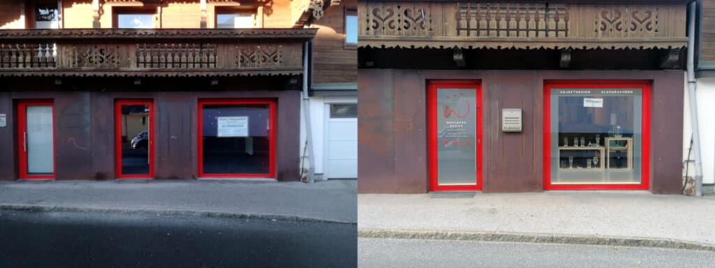 Wir besichtigten zwei Geschäftslokale: Zuerst eines im Ortszentrum, anschließend jenes, welches mein Interesse ausgelöst hatte. Mein Bauchgefühl tendierte eindeutig zu letzterem Raum. Dieser ist nun mein Atelier für Objektdesign und Glasgravuren!