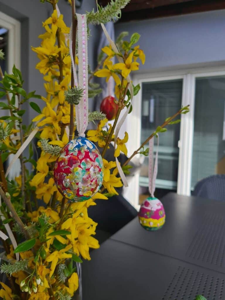 Genau das haben die beiden heute auch gemacht. 🙂 Ich finde ja, dass das ein schöner Brauch ist, da die Ostereier eine kreative, bunte und fröhliche Dekoration im und ums Haus sind.