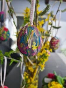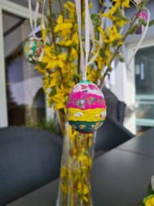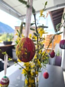 Genau das haben die beiden heute auch gemacht. 🙂 Ich finde ja, dass das ein schöner Brauch ist, da die Ostereier eine kreative, bunte und fröhliche Dekoration im und ums Haus sind.