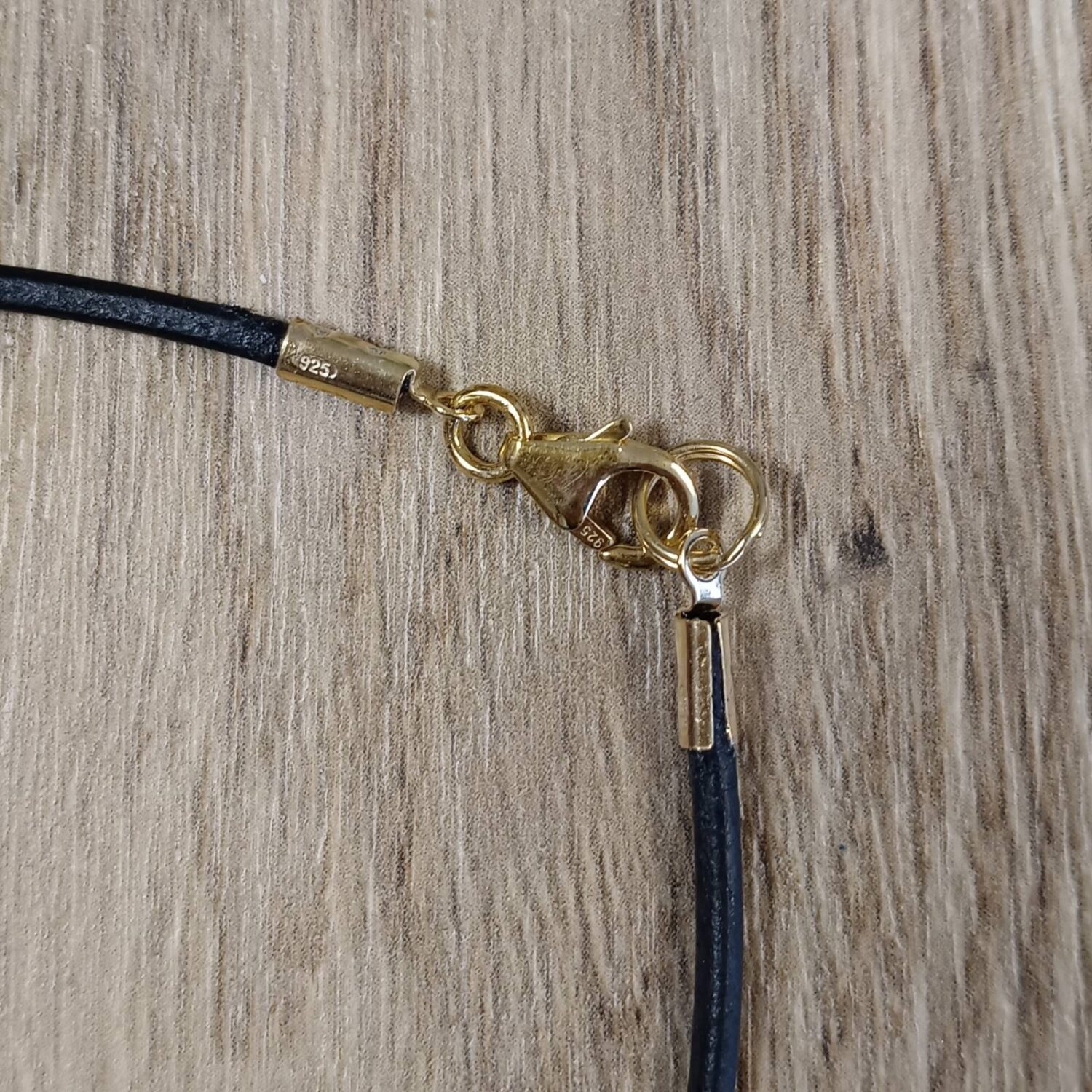 Für optimalen Tragekomfort wurde auf hochwertige Materialien geachtet: Das schwarze Lederhalsband ist angenehm auf der Haut und wird mit einem vergoldeten Silberverschluss geschlossen, sodass sich das Schmuckstück schnell und sicher anlegen lässt. Hergestellt in Istanbul und abschließend in Tirol verfeinert, entsteht hier ein einzigartiges Schmuckstück mit internationalem Flair. Ob für den Alltag oder als besonderes Accessoire – dieser Anhänger zieht garantiert alle Blicke auf sich und verleiht jedem Outfit eine elegante, individuelle Note.