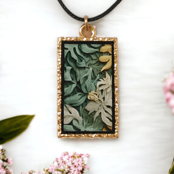 Dieser kunstvolle Anhänger von juliagiulina vereint traditionelle Handwerkskunst mit modernem Design. Aus hochwertiger Bronze gefertigt, besticht er durch sein farbenfrohes Motiv, das mittels ultratransparentem Epoxy-Harz zuverlässig vor Kratzern und Beschädigungen geschützt ist. Der rechteckige Anhänger misst 33 mm × 20 mm und zeichnet sich durch seine lebendige Farbwirkung sowie die grob strukturierte Bronze-Fassung aus. Die Länge des Lederbands misst 45cm.