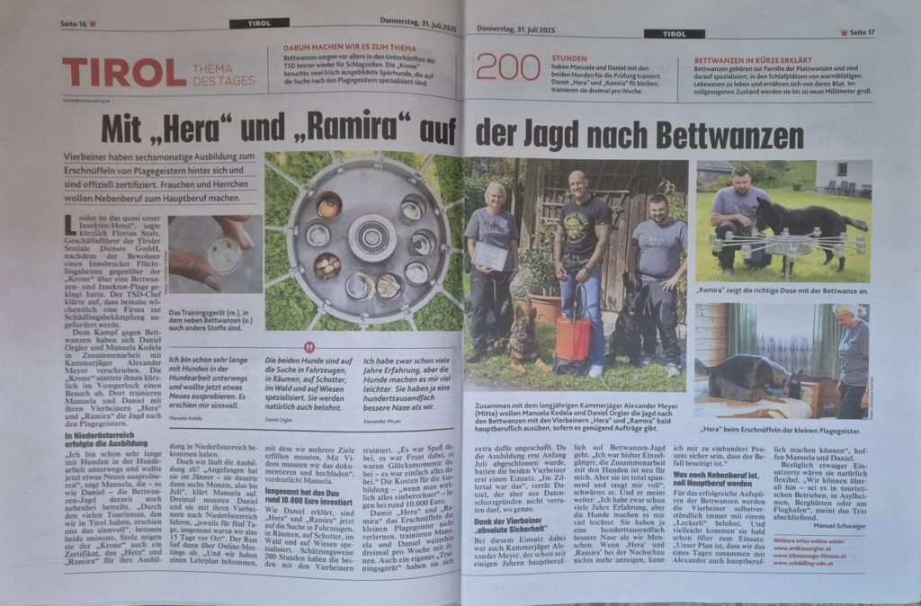 Unsere top-ausgebildeten Spürhunde, dazu gehören auch wöchentliche Trainings, garantieren es auch nur geringste Bettwanzenpopulationen anzuzeigen und somit dem Kammerjäger ermöglichen gezielt vorzugehen.